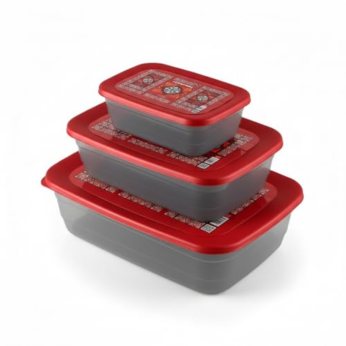 - مجموعة كاملة: تتميز مجموعة حاويات تخزين الطعام المستطيلة المكونة من 3 قطع بهيكل بلاستيكي شفاف خالٍ من BPA مع أغطية حمراء مزخرفة مستوحاة من رمضان بثلاثة أحجام مريحة: 900 مل (20.5 × 13.5 × 6 سم)، 1500 مل (25.5 × 16.5 × 7.5 سم)، و 3000 مل (31.5 × 20.5 × 9 سم)