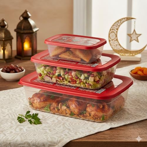Max Plast - حاويات تخزين طعام مستطيلة مع اغطية مستوحاة من رمضان، بلاستيك خالٍ من البيسفينول ايه، مجموعة من 3 قطع، امنة للاستخدام في الميكروويف والفريزر