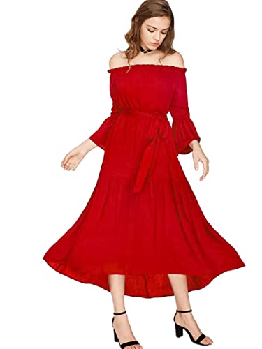 Generic - فستان شيفون احمر مكشوف الكتفين مزود ببطانة ، للنساء
