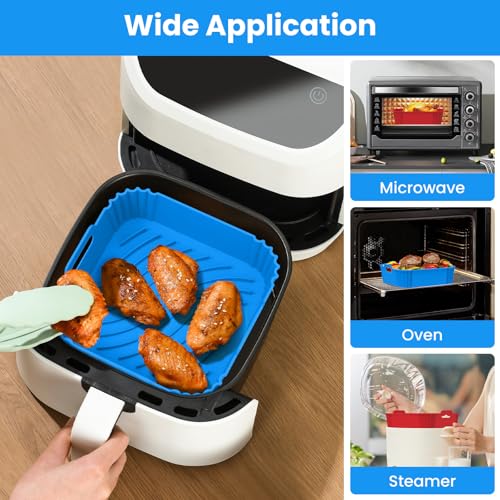 - Wide Application -The square silicone air fryer liners is widely used as a cookie sheet or air fryer trays for cooking, baking, or frying chicken wings, potato chips, fries, onion rings, baked cakes, bacon, egg tart, etc. The high-temperature resistance of the reusable silicone air fryer liners allows it to be used in a variety of kitchen small appliances, such as air fryer ovens, air fryer pan, deep fryers for the home with baskets, toasters, and microwave ovens