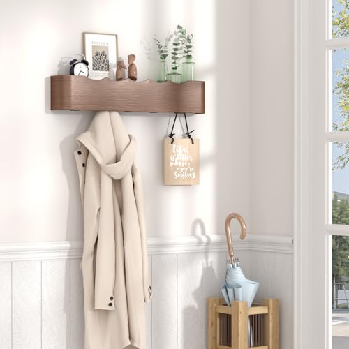 REFGY - Coat Rack Wall Mount with Shelf, Wood Coat Hanger Wall Mount with Hidden Wall 5 Hooks, 20.6 inch Entryway Shelf for Hallway, Bathroom, Bedroom, Living Room (Walnut, 20.6 inch)