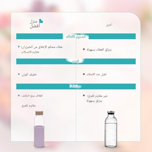 - توفر زجاجة المياه المصنوعة من زجاج البوروسيليكات الفاخر تجربة شرب أكثر صحة لأنها خالية تمامًا من الصدأ ومصممة لكل من البالغين والأطفال. على عكس الزجاجات البلاستيكية العادية، فإنها تضمن السلامة والمتانة والاستدامة، مما يجعلها خيارًا موثوقًا للترطيب اليومي في المنزل أو المكتب أو صالة الألعاب الرياضية أو أثناء السفر.