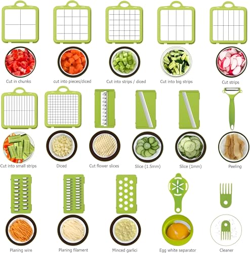 - With 14 different accessories, this chopper offers an array of options to cut vegetables into assorted shapes. You can easily create soft cut ingredients or thick slats, enhancing the look and feel of your dishes.