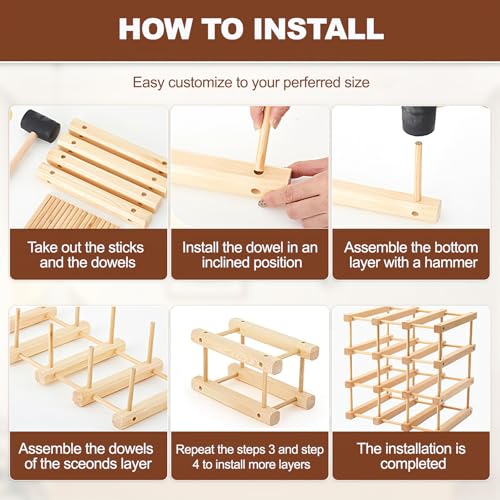 - أصبح التركيب بنفسك سهلاً: التجميع سهل ولا يحتاج إلى مسامير أو براغي. الثقوب المحددة مسبقًا والتعليمات الواضحة تجعل من السهل تركيب الرف للخزانة أو عرض سطح الطاولة باستخدام مطرقة فقط. يسمح لك الحجم القابل للتخصيص لوحدات الزجاجات (10 سم × 10 سم) بضبط الرف وفقًا لمساحتك وتفضيلاتك