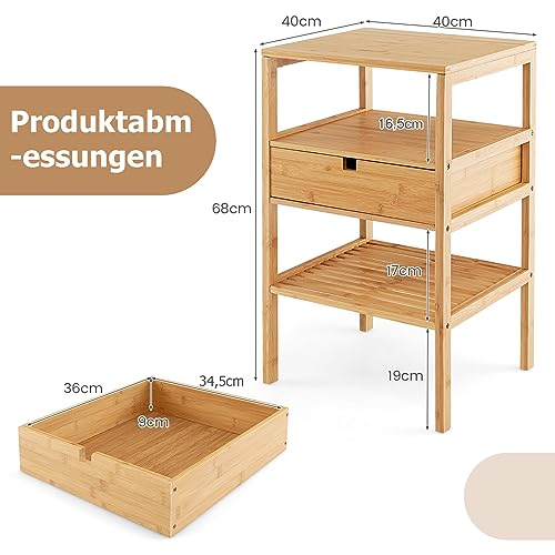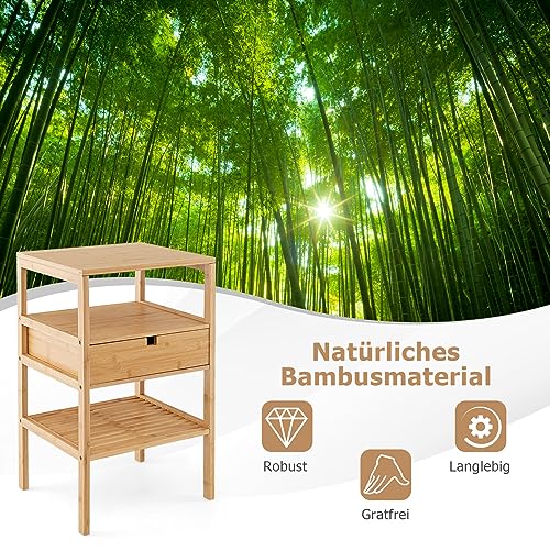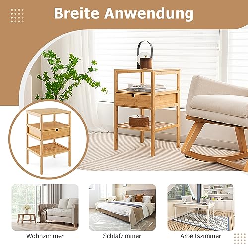 RELAX4LIFE - طاولة بجانب السرير من الخيزران من ريلاكس 4 لايف، مصممة بـ 3 أرفف ودرج 1، طاولة جانبية من 3 طبقات، طاولة قهوة لغرفة النوم وغرفة المعيشة والدراسة، مقاس 40 × 40 × 68 سم، لون خشب طبيعي