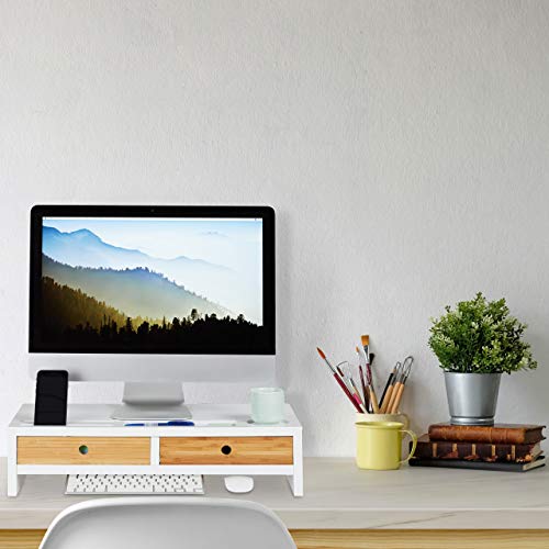 - Storage space: Monitor stand with two drawers and 4 compartments for office supplies, phone, tablet, mugs and more