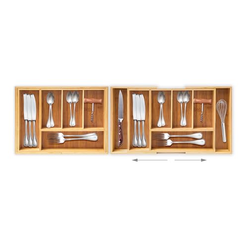 - Extendable: Bamboo cutlery holder with 5 main compartments and 2 pull-out - Variable width