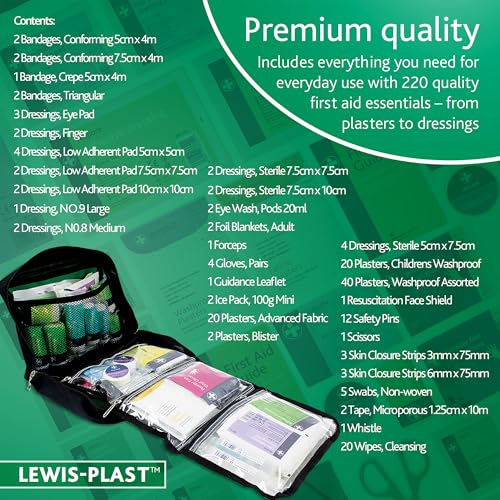 Reliance Medical - شنطة أدوات إسعافات أولية طبية ريلاينس من لويس بلاست - 220 قطعة من أدوات النجاة - أساسيات السلامة للسفر والسيارة والمنزل والتخييم والعمل والمشي لمسافات طويلة والعطلات - مستلزمات التغليف - مقاس L