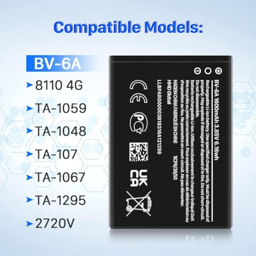 Generic - بطارية بديلة Bv-6A متوافقة مع جوال نوكيا 8110 شبكة الجيل الرابع 4G وTA-1059 TA-1048 TA-1067 TA-1071 TA-1295 2720V فليب 2017 2060 3060 5250 | سعة 1500 مللي امبير في الساعة