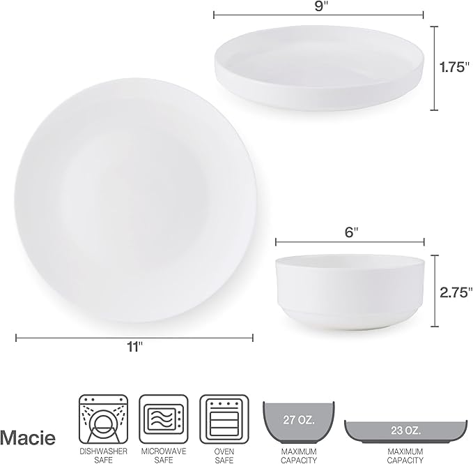 - طاولة لأربعة أشخاص: طقم من 12 قطعة تتضمن 4 أطباق عشاء مقاس 28 سم، وعاء متعدد الأغراض 15 سم بسعة 700 مل، ووعاء مكرونة 23 سم بسعة 600 مل