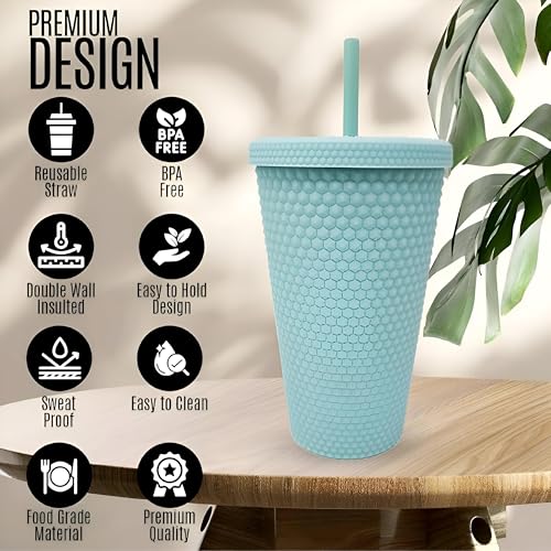 Generic - كوب بلاستيكي قابل لاعادة الاستخدام بغطاء محكم الغلق مع ماصة للشرب يحافظ على المشروبات طازجة وباردة، سعة صغيرة 470 مل، ارتفاع 16 سم، قطر 7 سم، مثالي للالوان المرطبة الموضحة في الصور