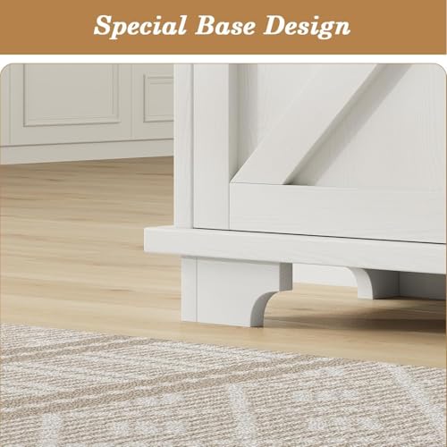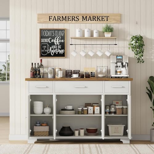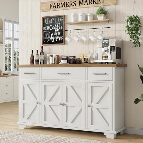 REVOMINCA - خزانة بوفيه مقاس 55 انش من ريفومينكا مع 3 ادراج و4 ابواب حظيرة، طاولة قهوة جانبية للمطبخ، بار قهوة ريفي مع مساحة تخزين، ابيض