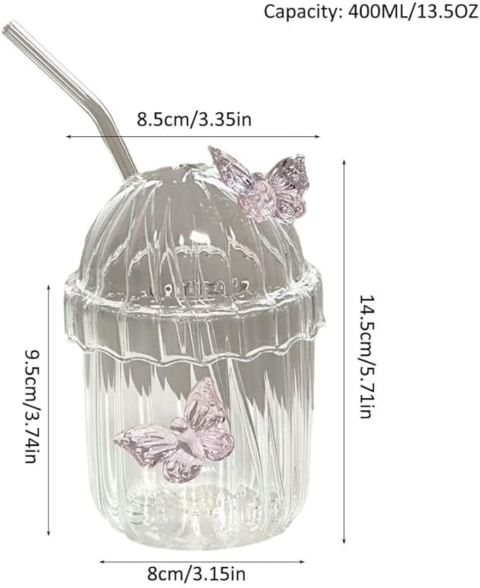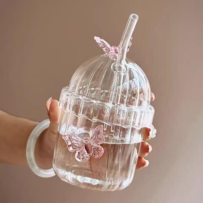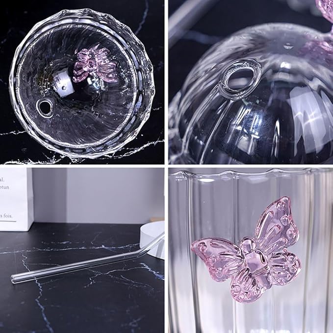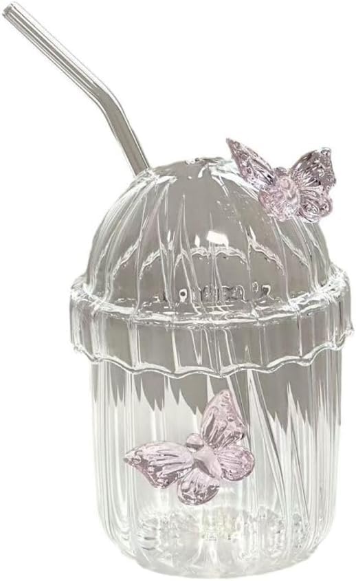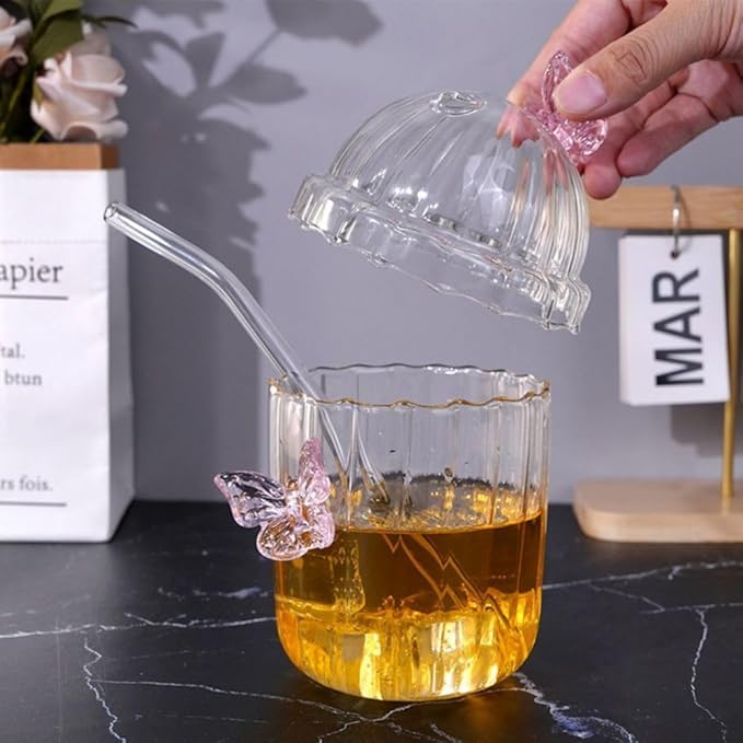 - Butterfly Ribbed Glass Cup, Butterfly Drinking Glasses Butterfly Glass Tumbler with Straw and Lid, Coffee Mug Tea Cup Striped Drink Cups for Coffee, Juice, Beer, Whiskey, Milk, etc