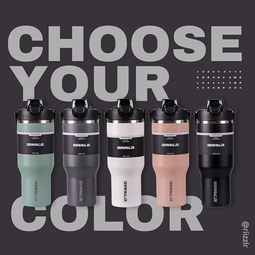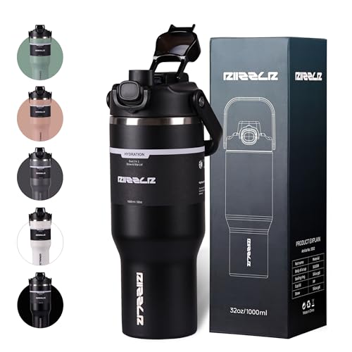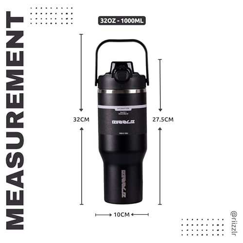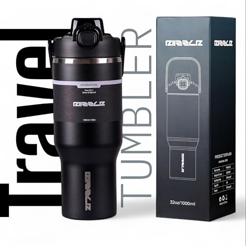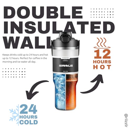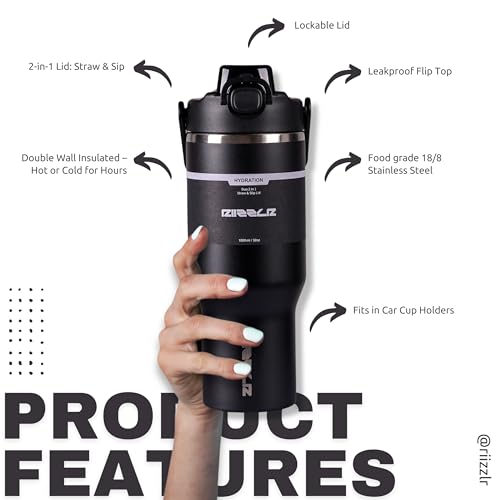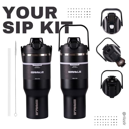 Riizzlr - 32oz Insulated Water Bottle Tumbler with 2-in-1 Straw & Sip Lid – Stainless Steel Vacuum Flask, Double Wall, BPA-Free, Leakproof, Wide Mouth, Keeps Drinks Hot 12H / Cold 24H (Black)