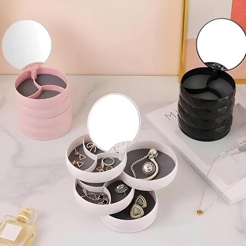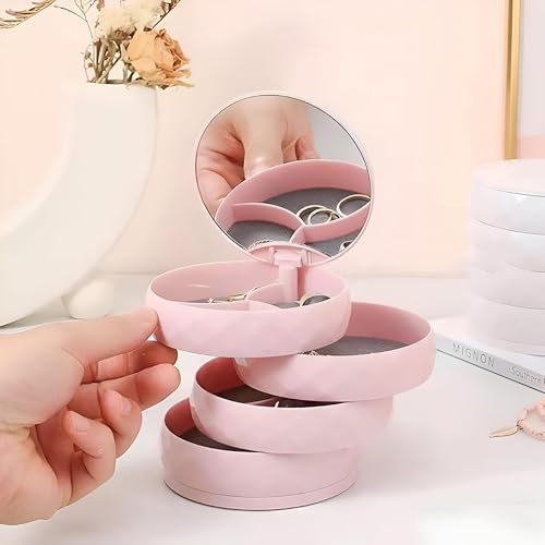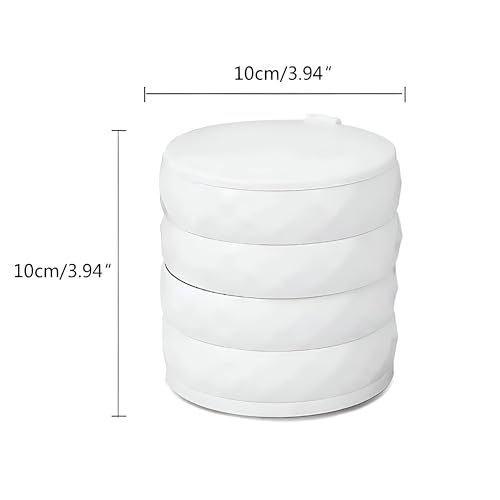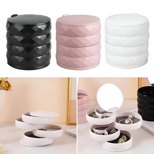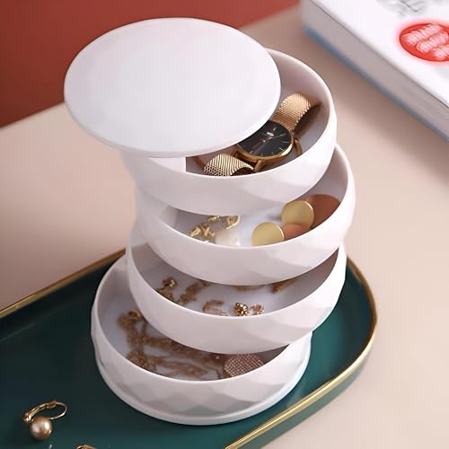 - منظم مجوهرات دوار صغير الحجم مزود بأربعة أدراج متعددة الطبقات، مثالي لحفظ الأقراط والخواتم والأساور والإكسسوارات بشكل منظم ومنفصل. تصميم متين وأنيق يوفر مساحة على أي طاولة زينة.