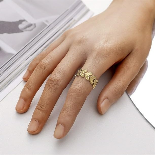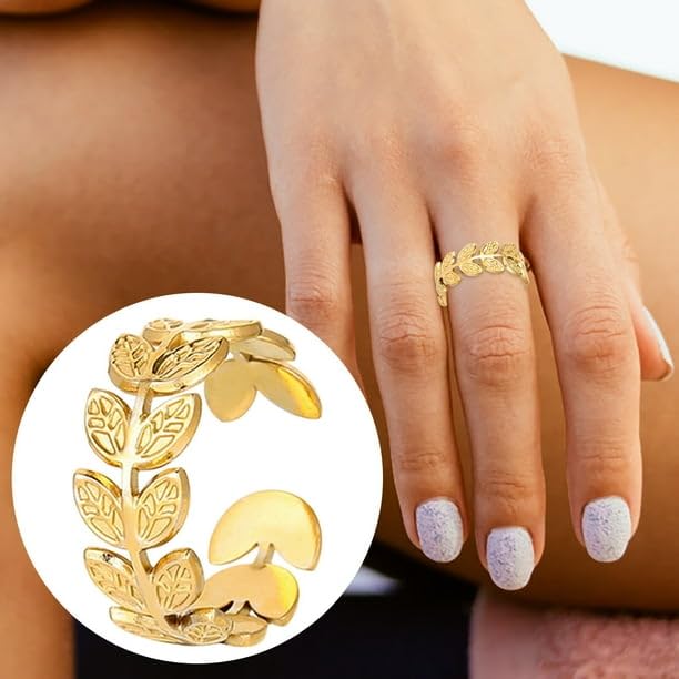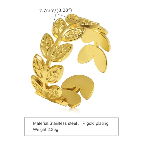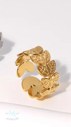 Generic - خاتم بتصميم ورقة قمح من الستانلس ستيل مطلي بالذهب عيار 18 قيراط للنساء، هدية رائعة للصداقة وعيد الحب - قابل للتعديل