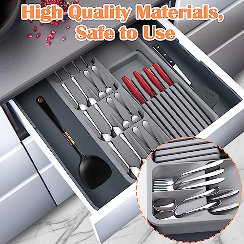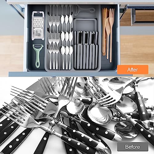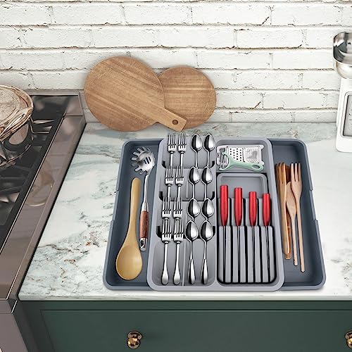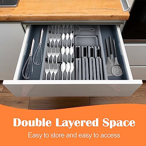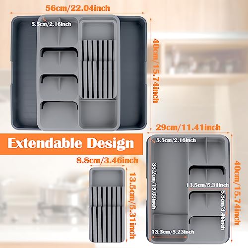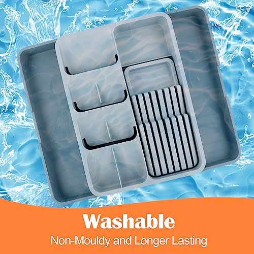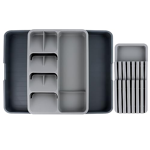 RISVOWO - Cutlery Organiser for Drawer, Expandable Kitchen Storage, Adjustable Drawer Organizer for Kitchen, Drawer Storage for Spoons, Forks, Knife, 40 x 56 x 5.5 cm, Grey
