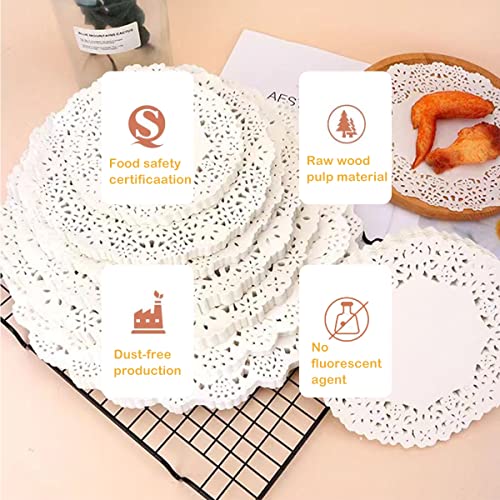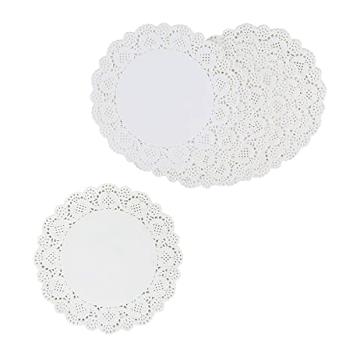 - محتويات العبوة: 150 قطعة من مفارش طاولة دانتيل ورقية دائرية بيضاء مقاس 12 انش. (30 سم)