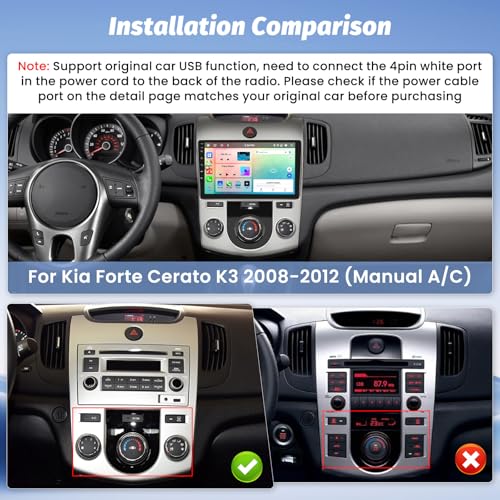 - ⚠𝐌𝐚𝐭𝐭𝐞𝐫𝐬 𝐍𝐞𝐞𝐝 𝐀𝐭𝐭𝐞𝐧𝐭𝐢𝐨𝐧: This upgraded radio dash kit is for kia forte 2008 2009 2010 2011 2012 in Manual A/C version. The stereo comes with an in-dash head unit, wiring harness cables and frame panel. Supports most stock features - USB function, power amplifier and more. Please check if the power cable port on the detail page matches your original car before purchasing.