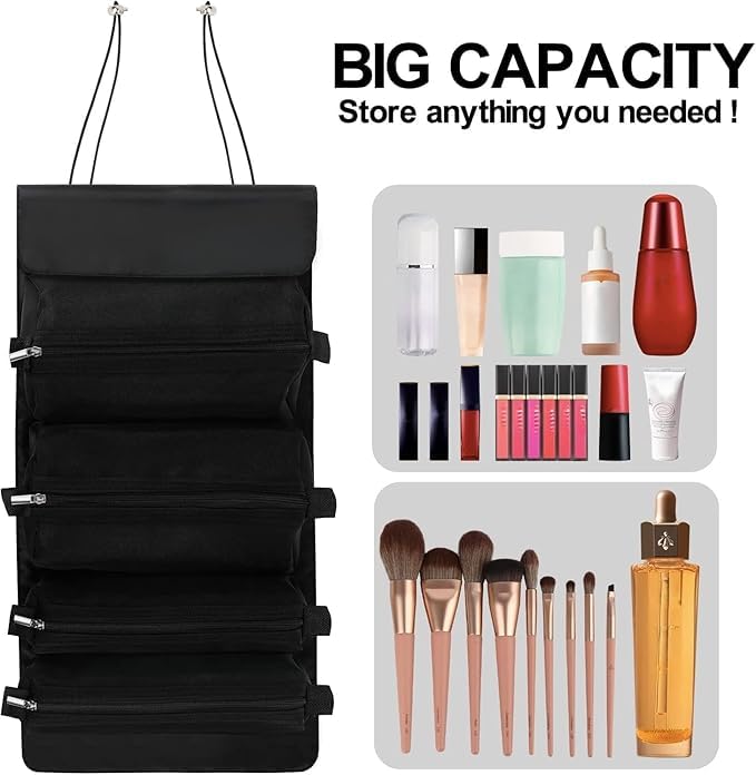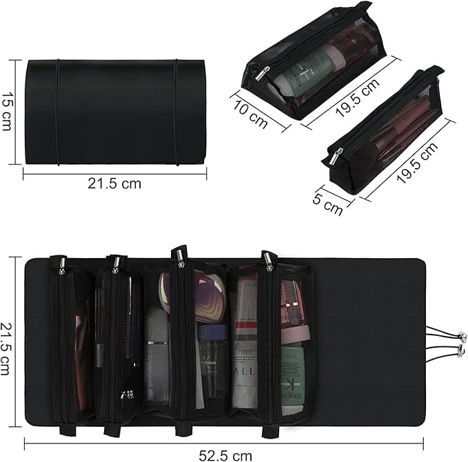 - DESIGN FEATURES: Roll-up travel organizer with 5 separate zippered compartments for efficient organization of toiletries and cosmetics
