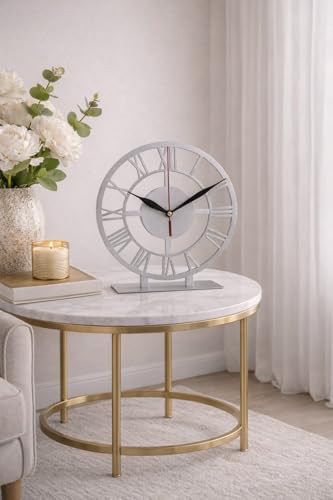 - .تصميم عصري أنيق: ساعة مكتبية معدنية بأرقام رومانية كلاسيكية مع إطار مفتوح يضيف لمسة فنية راقية لأي مساحة