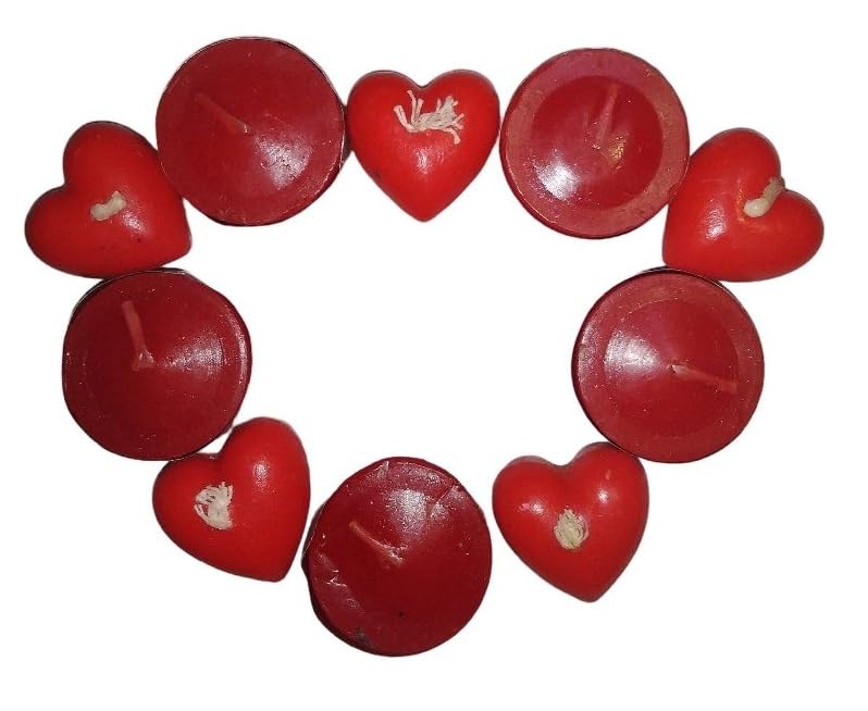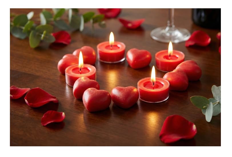 - Romantic Atmosphere: Perfect for creating a warm and sensual atmosphere in bedrooms, dinner tables, valentines day. Assorted design: the set includes an eye-catching combination of Round Tea Lights and Holographic heart candles. HIGH QUALITY: Candles made with high quality waxes that give a quiet and stable light. MULTI-FUNCTION: Can be used inside essential oil diffusers, as a standalone decoration, or for floor and pool decoration for events Hot red color: a classic red color that expresses love and adds style to any space.