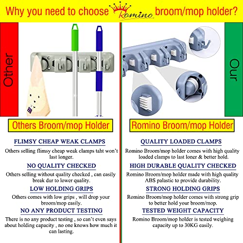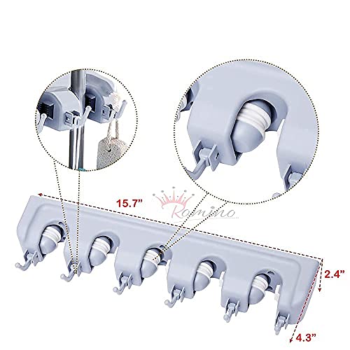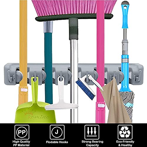 ROMINO - منظم بحامل سحري مثبت على الحائط من البلاستيك المطور مع تثبيت قوي وفعال للمكنسة والممسحة 5 فتحات و6 خطافات لتخزين المراب حتى 11 أداة رومينو متعدد