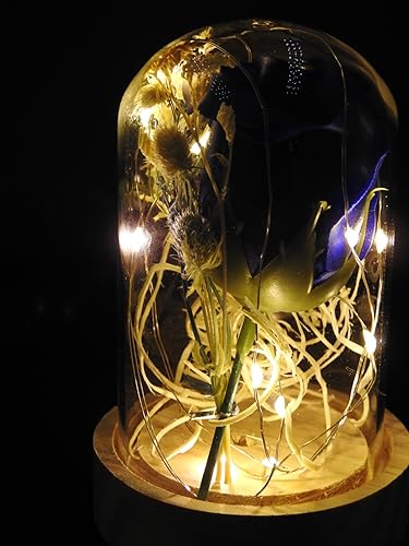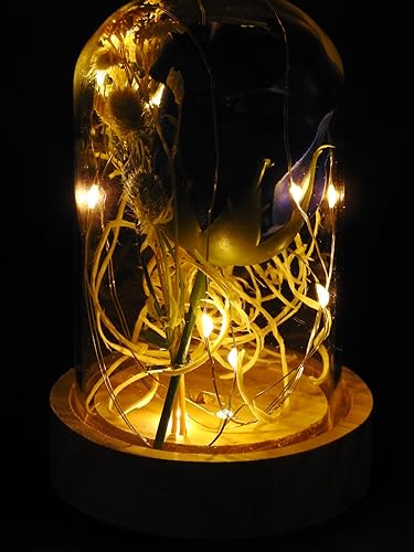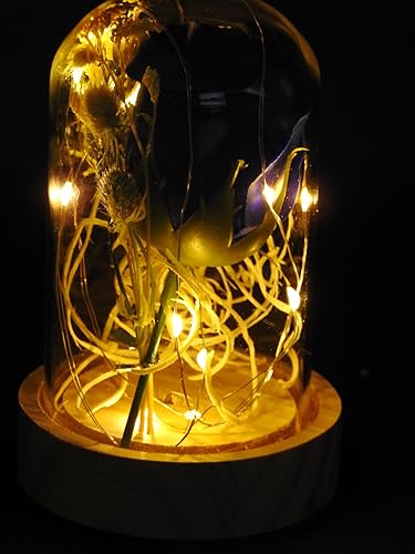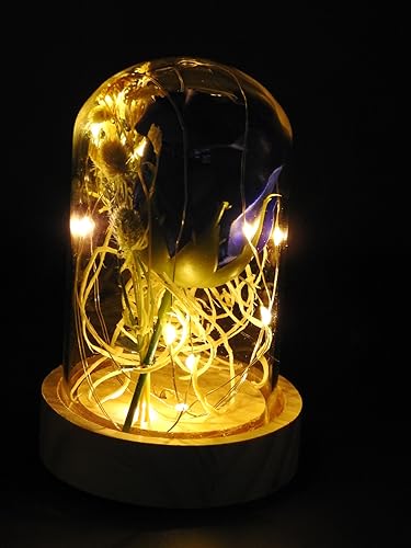 - Color:Transparent Material:Glass dome, Pine wooden bottom, Artificial rose-LED Usage:Decoration,Gift Light Color:Warm White Switch: ON/OFF