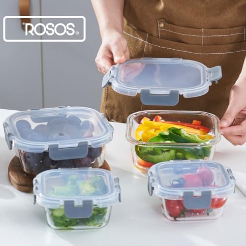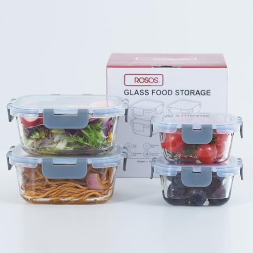 ROSOS - حاويات زجاجية مع غطاء عبوة من 4 تخزين طعام محسن خالية BPA للطعام ومقاومة للتسرب للفرن - الفريزر رمادي