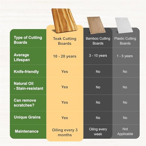 - 𝐊𝐍𝐈𝐅𝐄-𝐅𝐑𝐈𝐄𝐍𝐃𝐋𝐘 & 𝐇𝐈𝐆𝐇𝐋𝐘 𝐃𝐔𝐑𝐀𝐁𝐋𝐄: Teak cutting board is made of 100% natural Teak wood, providing higher durability than others like bamboo cutting board, plastic cutting board. Our board's surface is sturdy, ensuring your knife does not get dull over time.