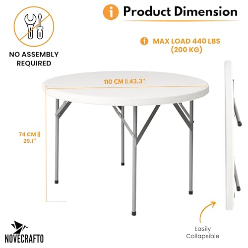 - EASY TO CLEAN – Made from high-density polyethylene plastic (HDPE), the 43.3'' x 29.1'' (110 x 74 cm) folding white round table resists scratches and is easy to wipe clean. Its robust design can comfortably seat 4-6 people.