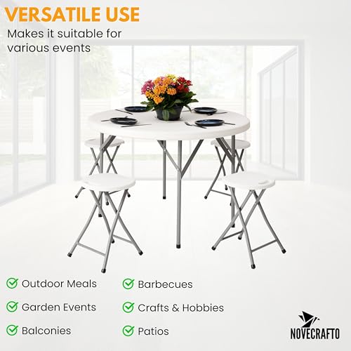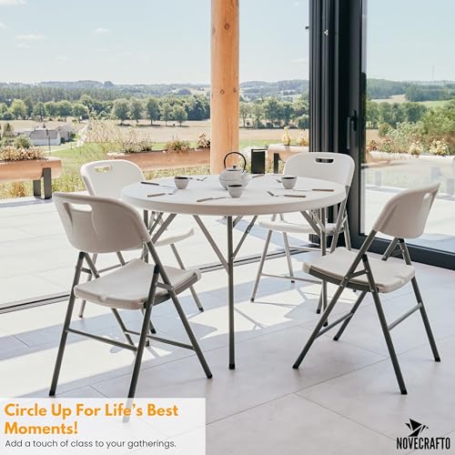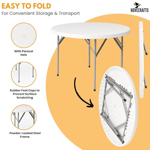 NOVECRAFTO - Round Folding Table with Parasol Hole - Plastic Portable Sturdy Fold Up Table White 43.3'' x 29.1'' (110 x74 cm) for Indoor Outdoor Use, Garden Party, BBQs, Picnic, Banquet Outing & Family Gatherings