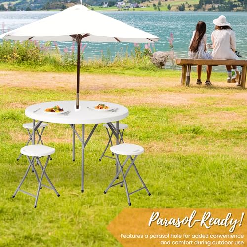 - QUICK AND SIMPLE SETUP – No tools needed! The folding round table top with parasol hole sets up and folds down in seconds, ideal for quick gatherings and easy storage. Powder-coated steel legs provide strong support.