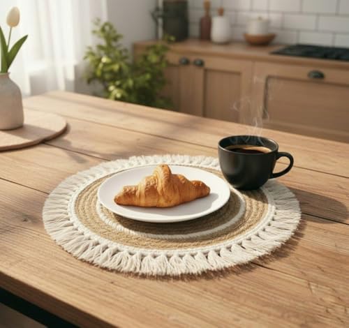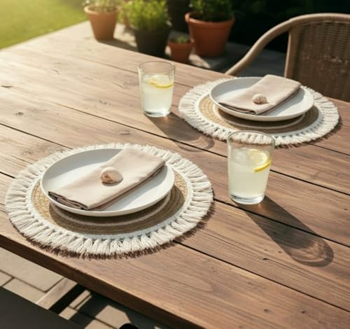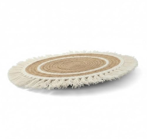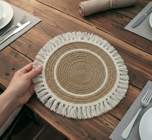 Generic - لوحة خوص طبيعية دائرية بشراشيب بأسلوب بوهو سميك قابل للغسيل لتقديم الأطعمة وتنظيم الطاولة ولمسة ديكور جذابة