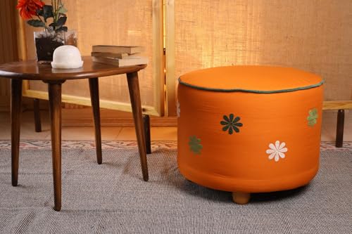 - DECORATIVE DESIGN: Vibrant orange upholstered ottoman features charming floral embroidery in multiple colours including green, white, and dark accents, complemented by contrasting green piping trim for a stylish bohemian look