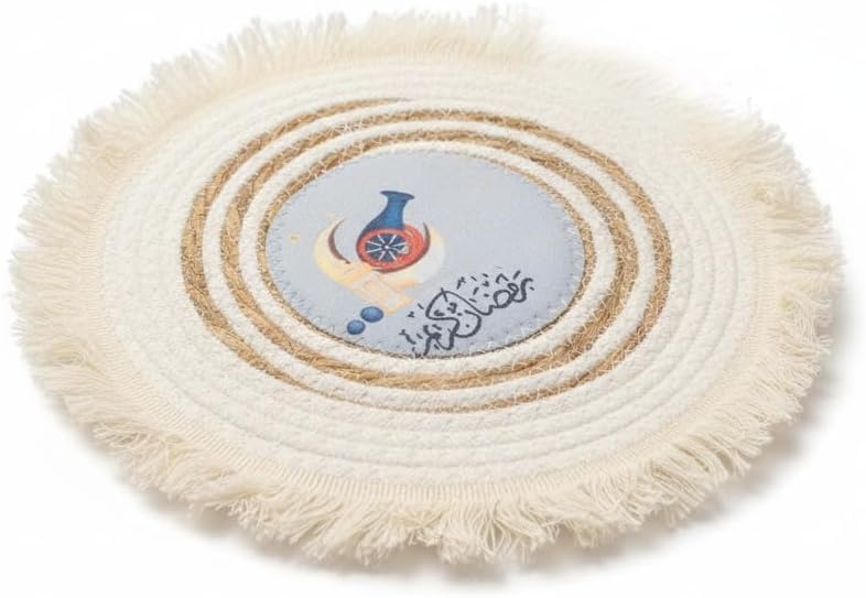 - تصميم رمضاني مميز: مفرش طاولة دائري يتميز بطباعة رمضان كريم مع رسومات تقليدية للفانوس والهلال، مثالي لإضفاء أجواء روحانية على مائدة الإفطار والسحور