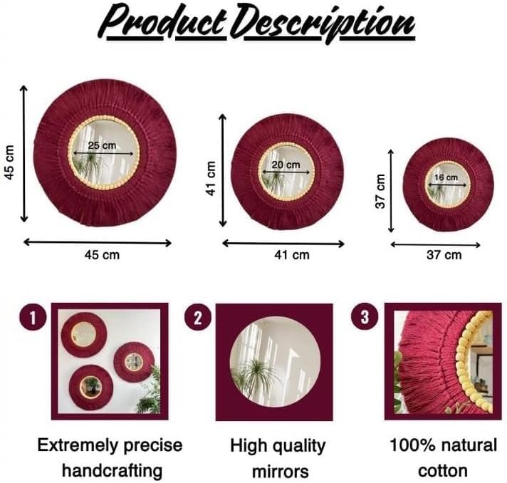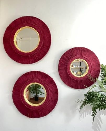 - HANDCRAFTED DESIGN: Set of 3 round wall mirrors featuring burgundy red cotton fringe surrounding a gold beaded frame, adding a bohemian touch to any living space