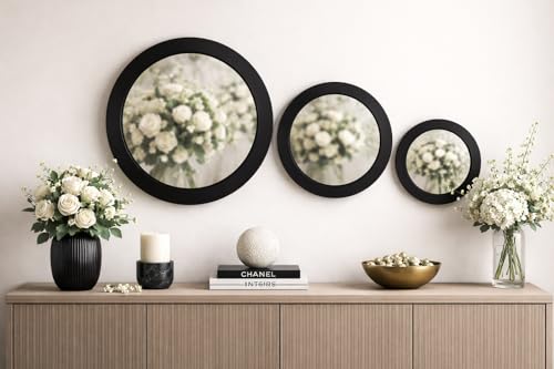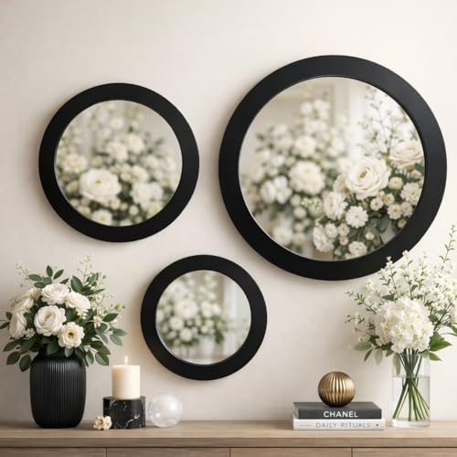 - Set of 3 Round Mirrors: Includes three round wall mirrors in a modern black frame in various sizes to add depth and style to any room