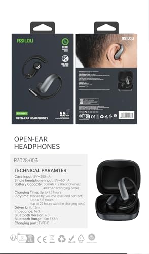 rsilou - R3028 Open-Ear Bluetooth Earbuds, Up to 22H Battery Life, Bluetooth 6.0, 12mm Drivers, Ultra-Light 6g Design, Tuned Sound Quality, Touch Controls, 1 Year Local Warranty (black)