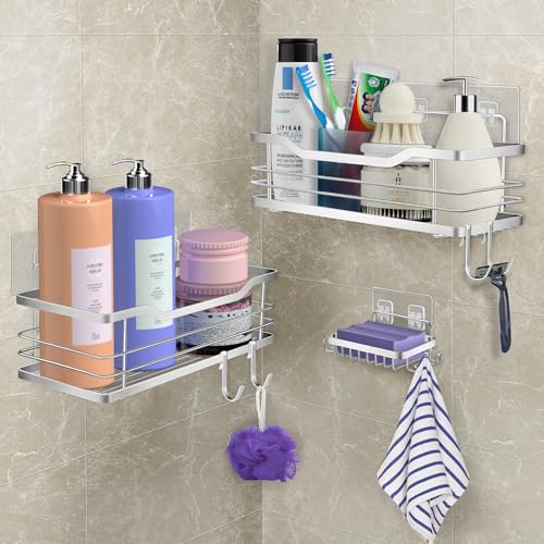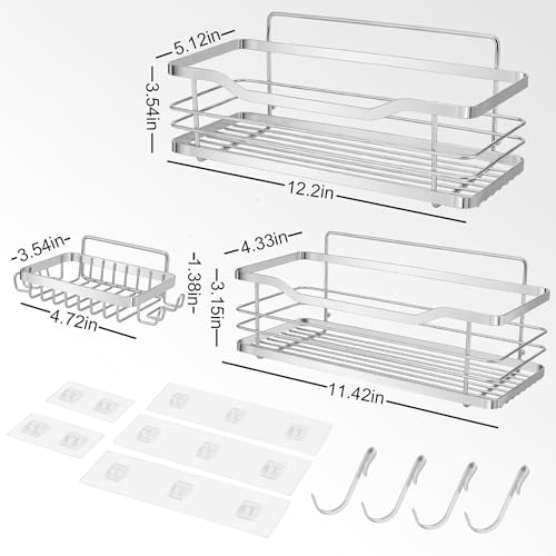 Ruhetfam - Shower Caddy, 3-Pack Shower Caddy Shower Shelf with Hooks in Set of 3, Shower Shelf Without Drilling - Bathroom Shelves in 304 Stainless Steel