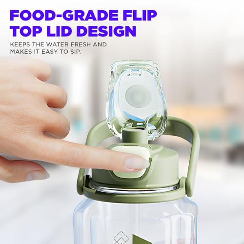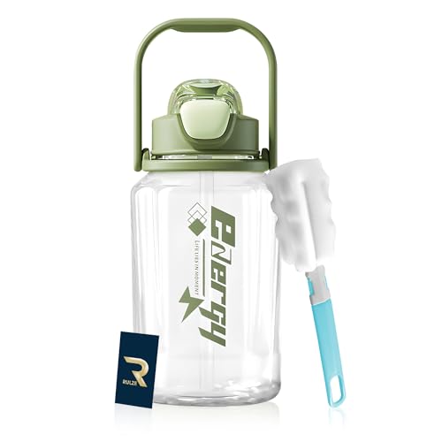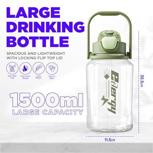 RULZE - زجاجة مياه رياضية سعة 1.5 لتر مع غطاء علوي قلاب بقفل وحزام حمل مانعة للتسرب خالية من مادة البيسفينول أ بسعة كبيرة للياقة البدنية قابلة لإعادة الاستخدام ومريحة وصديقة للبيئة من رولزي - (لون أخضر)