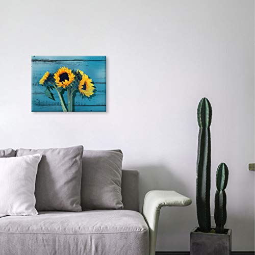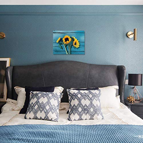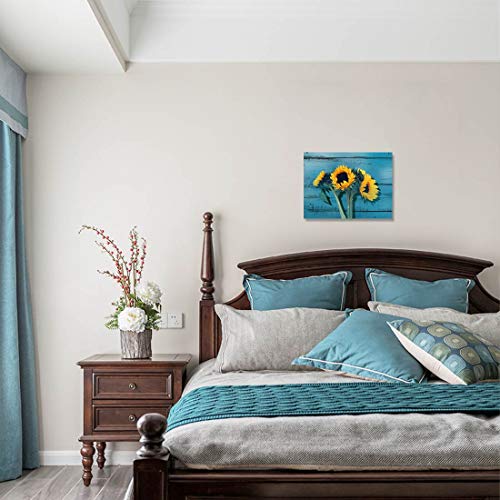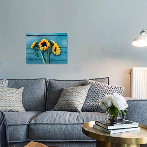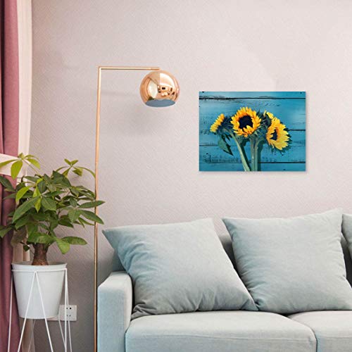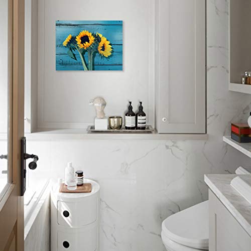 Fuwobriva - Rustic Bathroom Decor for the Home Country Wall Art for Bedroom Sunflower Themed Farmhouse Bathroom Pictures Teal Decor Kitchen Canvas Framed Artwork for Walls Blue Wooden Board Modern Home Size 12x16