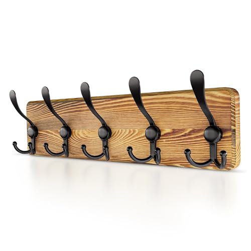 SAYONEYES - Wood Coat Rack Wall Mount with 5 Tri Coat Hooks for Hanging – 17 Inch Heavy Duty Premium Solid Pine Wood – Wall Hooks Rack for Bathroom, Bedroom, Entryway (Brown)