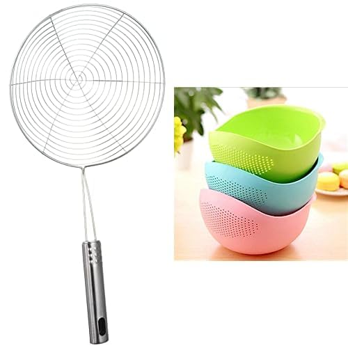 Rustomart - medium stainless steel strainer with long handle - silver+Rice bowl washing bowl and strainer for rice, fruits, vegetable, noodles, pasta for storing and straining (22x18x12 cm)