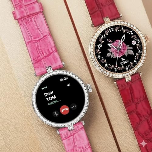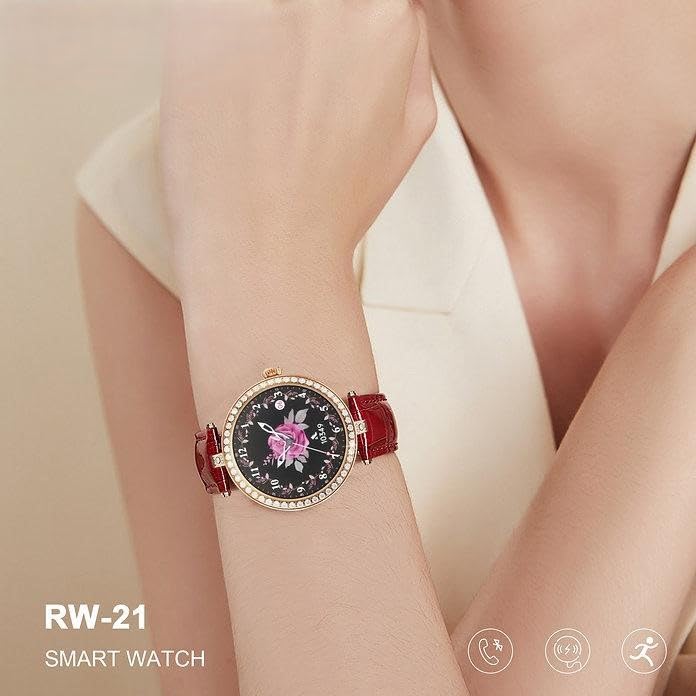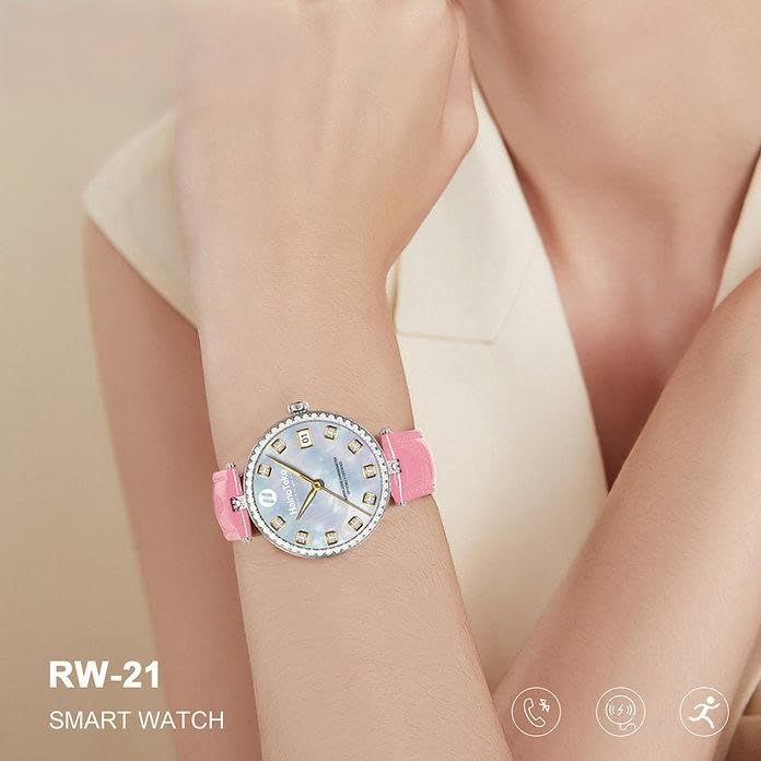 Generic - RW-21 Smart Watch – ساعة ذكية أنيقة بشاشة دائرية، مكالمات بلوتوث، تصميم كلاسيك، مع 2 سير إضافي – للنساء - روز جولد