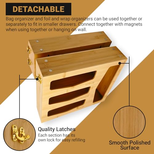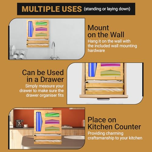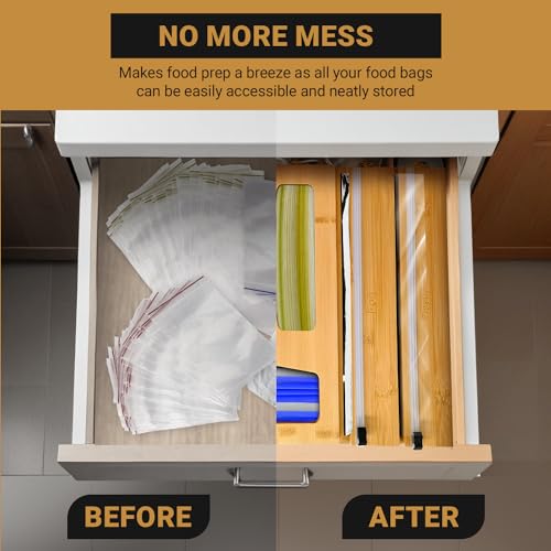 - قم بتنظيم مطبخك: حافظ على لفافات التغليف الخاصة بك مخزنة بدقة ويمكن الوصول إليها بسهولة مع منظم الأكياس المزود بسحاب من الخيزران. لا مزيد من الأدراج الفوضوية أو أسطح الطاولات الفوضوية.
