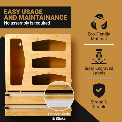 - خيزران عالي الجودة: مصنوع من الخيزران الطبيعي بنسبة 100%، منظم الأكياس بسحاب متين وصديق للبيئة وأنيق. يضيف لمسة من الأناقة إلى أي ديكور مطبخ.