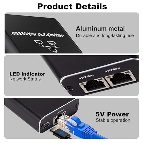 - 𝗘𝗧𝗛𝗘𝗥𝗡𝗘𝗧 𝗦𝗣𝗟𝗜𝗧𝗧𝗘𝗥 (𝗣𝗢𝗥𝗧 𝗖𝗢𝗨𝗡𝗧): The Rynli Ethernet Switch (Port Count) Port RJ45 Splitter allows you to connect two computers using a single Ethernet line simultaneously. This efficient solution is powered by the included USB cable, which enables seamless network port expansion. Note: A USB 5V power supply is required for operation, and it cannot function without this connection
