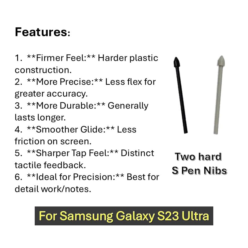 - Maximize your Galaxy S23 Ultra S Pen experience with premium hard nibs! Engineered for ultimate precision and a firmer feel, these durable nibs deliver exceptional control for detailed drawing, note-taking, and selections.
