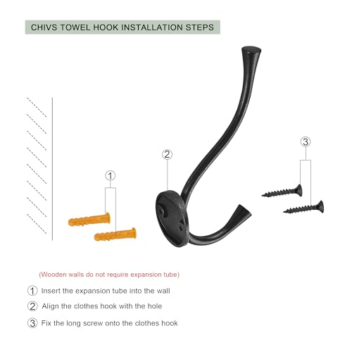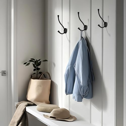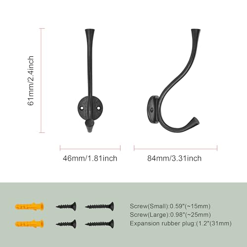 - [MULTIPLE USES]: Our hooks are designed with double hooks, hanging jackets, coats, hats, scarves, towels, keys, umbrellas, bags, Christmas stockings and Christmas wreaths to keep your home organized. Perfect for bathrooms, bedrooms, kitchens, closets, hallways, entrances and more. Recommended for installation on solid wood or wooden surfaces. Just choose where you want to install. Drill holes and screw the wall hooks into place for easy installation.